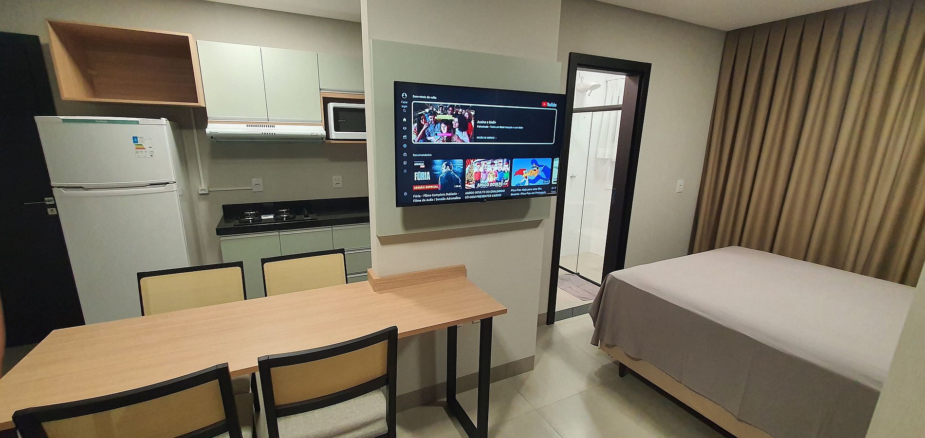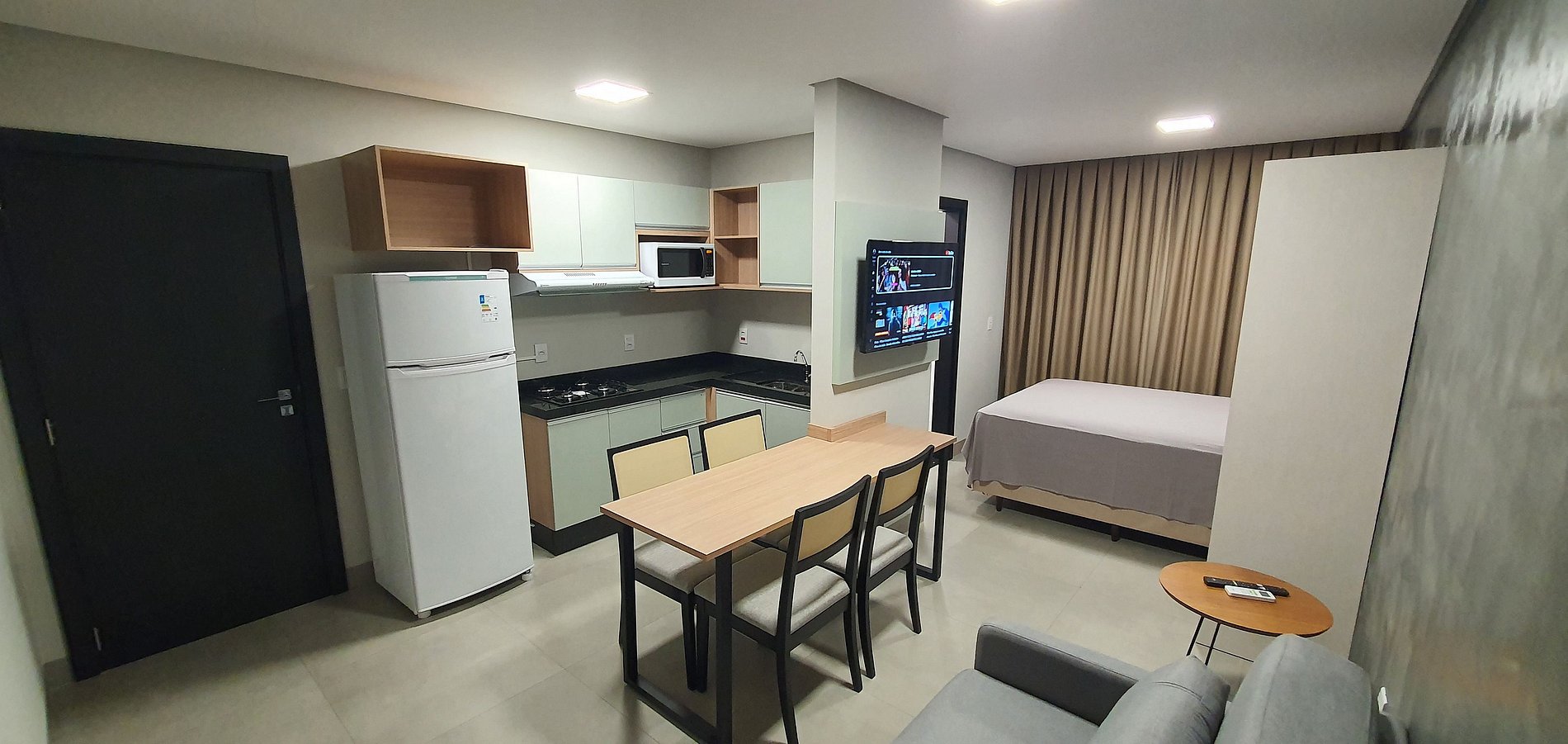 Todo mobiliado: ar condicionado, sofacama, cozinha completa, TV, roupa de cama e banho, wifi, mesa para jantar, utensiios de cozinha, banheiro completo.