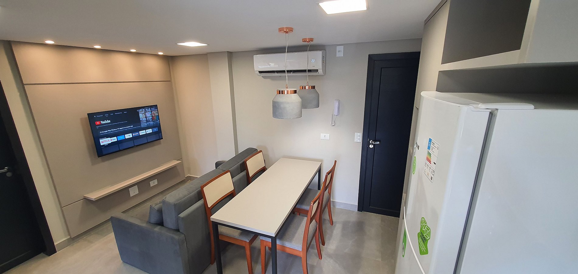 Ar condicionado em todos os cômodos, Smart TV, cozinha completa e com utensílios, elevador, garagem coberta, piscina e churrasqueira na área de lazer.