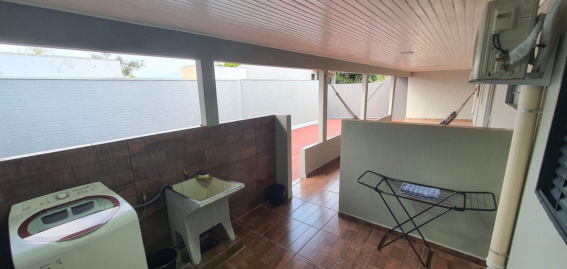 Varanda ampla e lavanderia completa com máquina, tanque, varal, tábua de passar roupas e ferro de passar roupas.