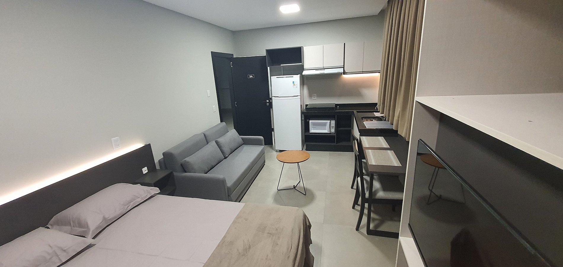 Moderno e completo o MZ atende todas as suas necessidades para hospedagem, sejam curtas e longas. Possui cama queen size, ar condicionado, internet wifi, Smarth TV, cafeteira, estacionamento e segurança.