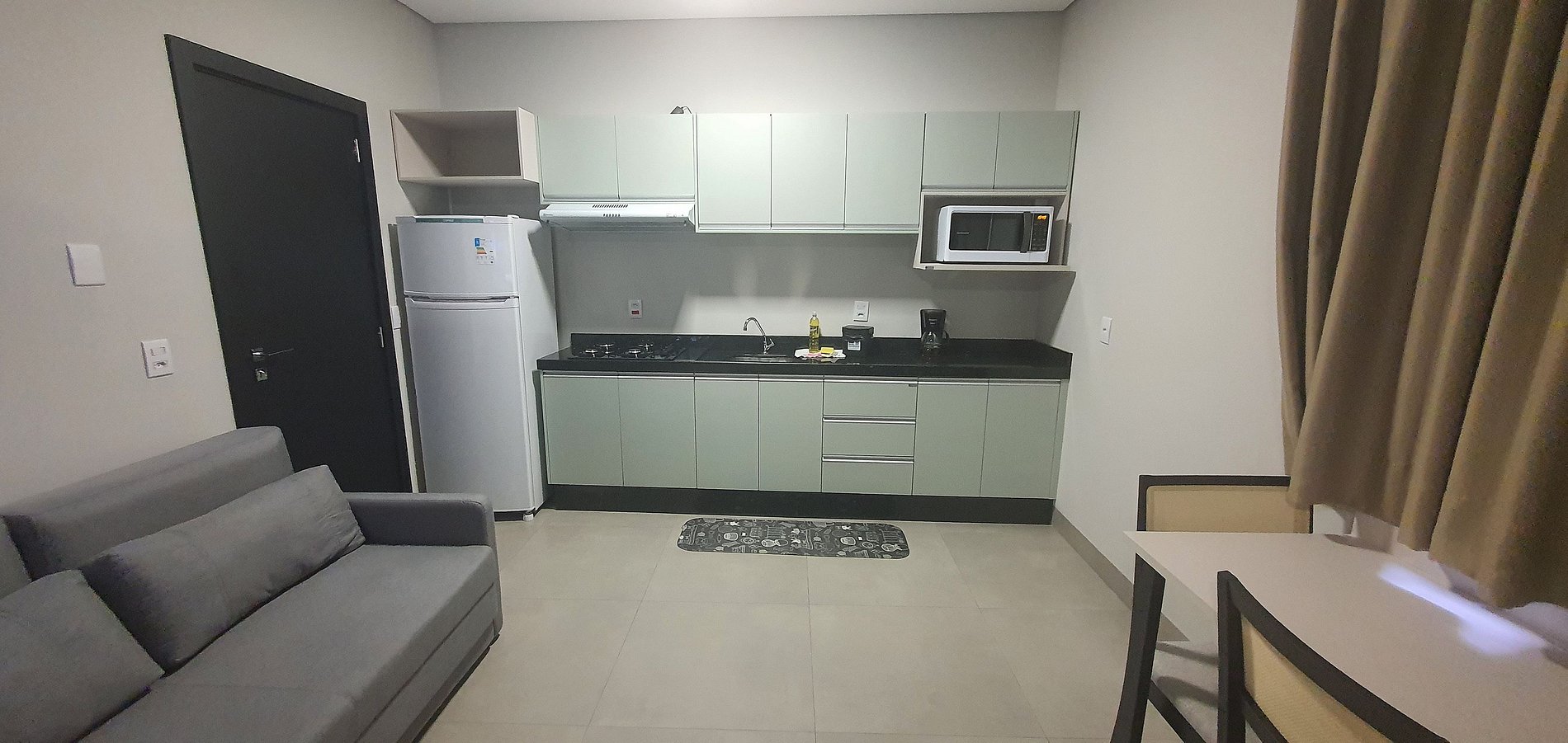 Todo mobiliado: ar condicionado, sofacama, cozinha completa, TV, roupa de cama e banho, wifi, mesa para jantar, utensiios de cozinha, banheiro completo.