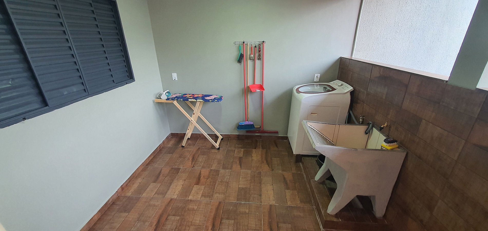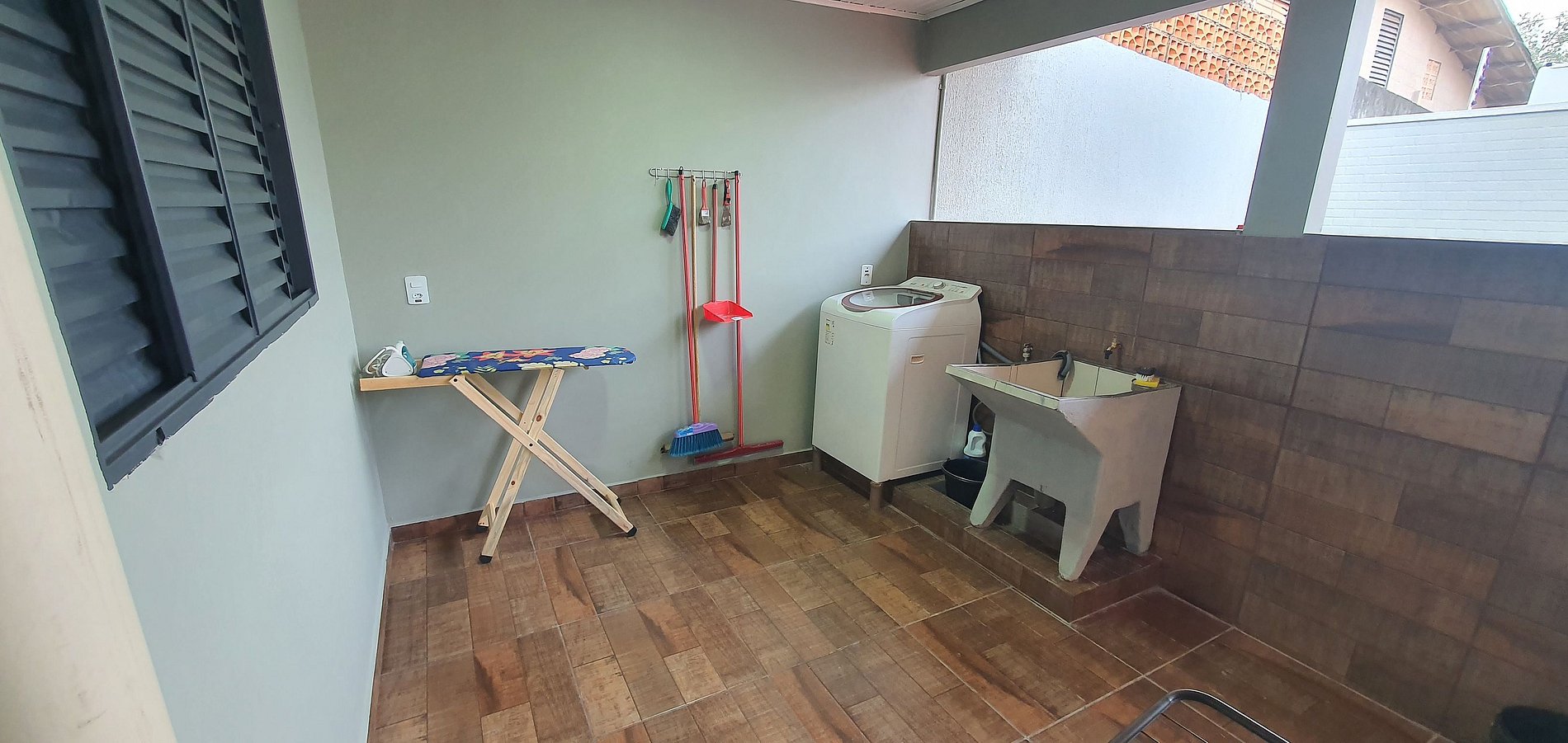 Varanda ampla e lavanderia completa com máquina, tanque, varal, tábua de passar roupas e ferro de passar roupas.